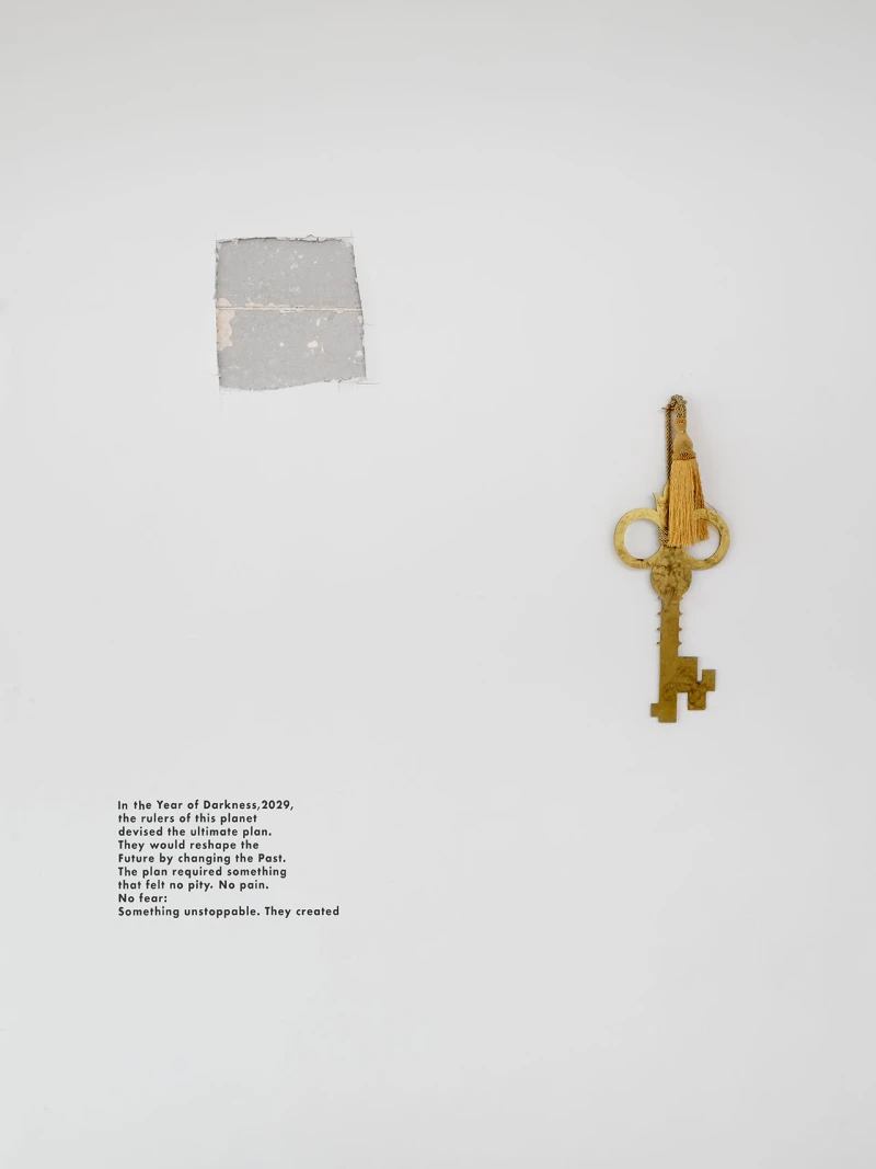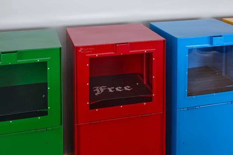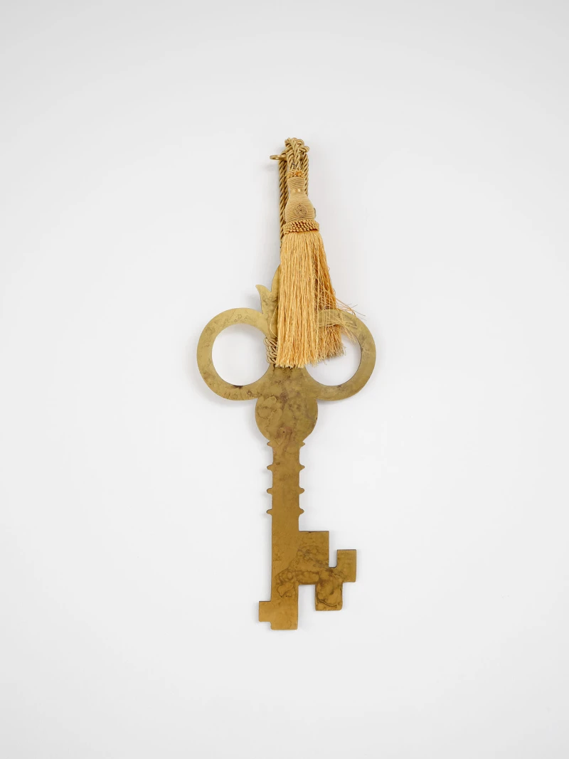 A caliper is erected at a colossal scale that transforms tool into spectacle; a mobile is constructed with Cosanti-wrought links and balanced with Murano-glass leaves; a promotional real-estate poster reimagines the Vienna Secession building as a luxury high-rise; a print is composed of a gestural, fax-warped reproduction of Le Corbusier’s designs for Algiers; highway ramps are coated with horizon-line hues and faded in the sun; silhouettes of gigantic keys and locks from around the world are cut out of brass sheets and patinaed; found newspaper dispensers are spray-painted into monochrome totems that house and disseminate free literature (such as this). Aspiring to precision, function, and idealism, Modernist architecture intrigues McBride with its inescapable complexities, failures, and humor. Her works test the extent to which the artist can approach democratic structures democratically, inviting both play and plan through actions of unlocking, tinkering, and reconfiguring. Like a body moving through space, these works orient rather than explain: implicit, visceral, and absurd.