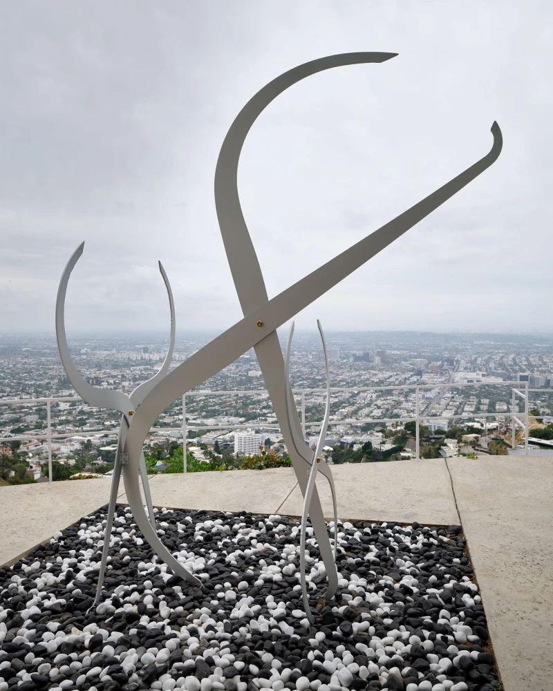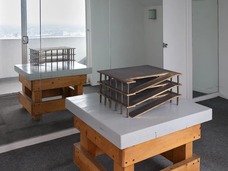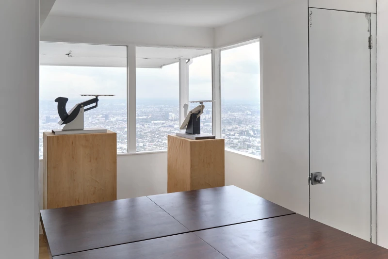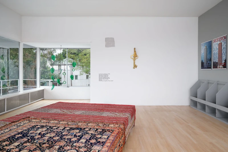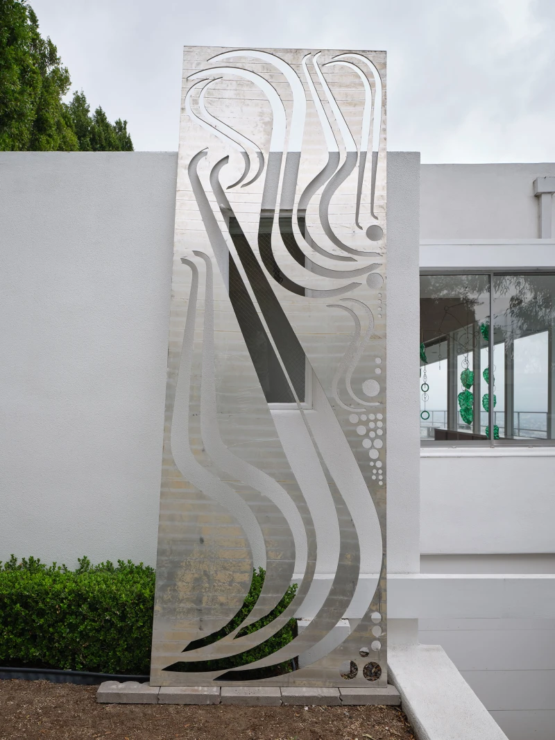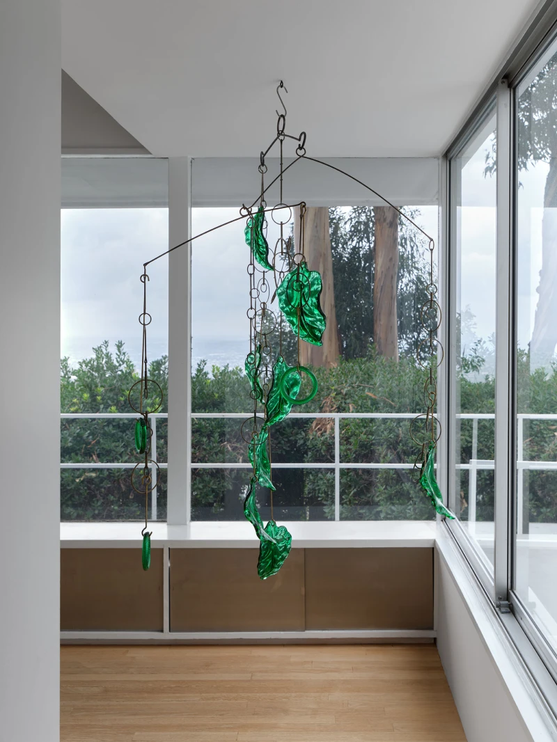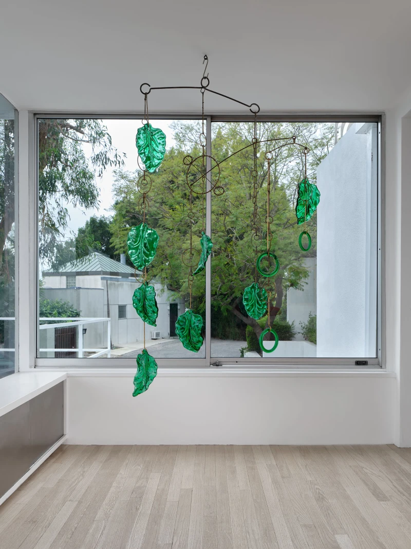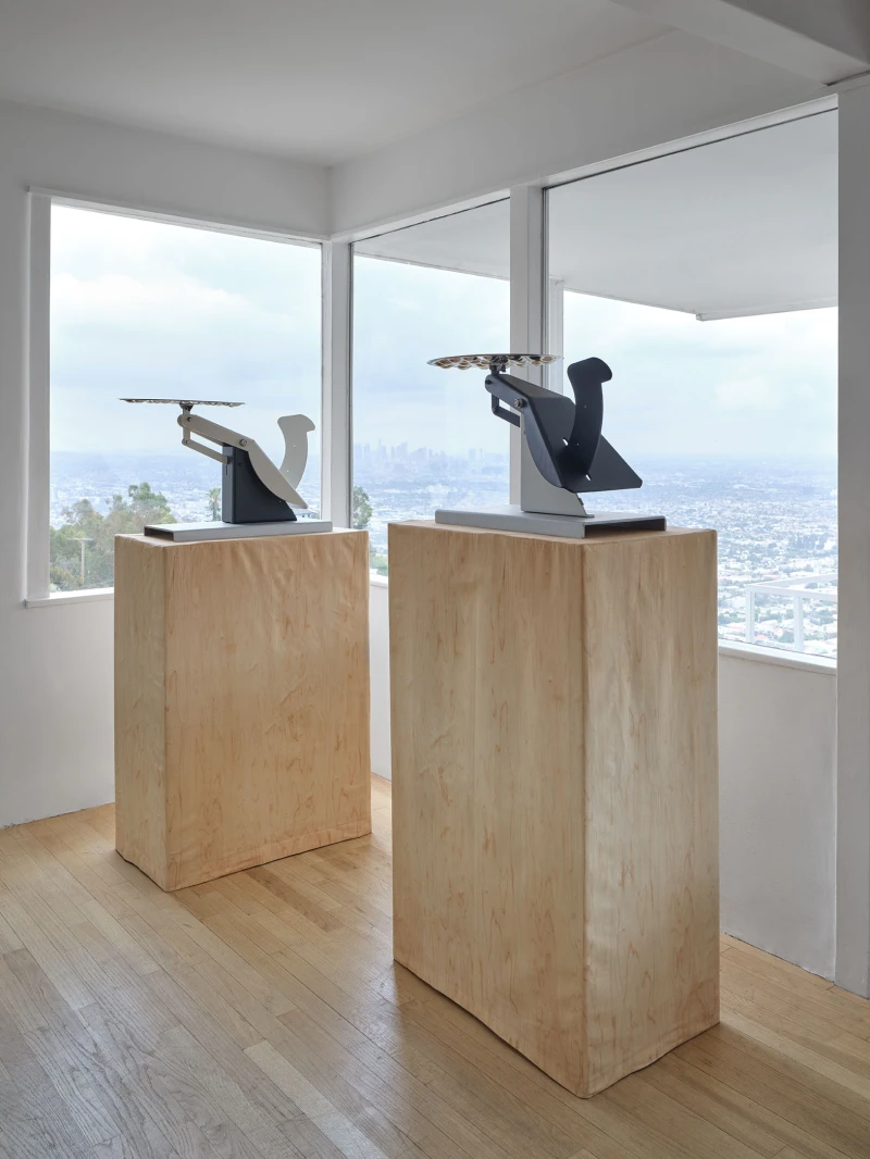 Presented by Del Vaz Projects and OKEY DOKEY KONRAD FISCHER, wunderkammer is an installation by Rita McBride at Blue Heights Arts & Culture—located at the house that the architect Richard Neutra designed for the German-Jewish émigré, artist/art collector, dealer, and educator Galka Scheyer in 1934. wunderkammer begins with McBride clearing space in her studio to create a singular, novel artwork. The circumstance of this rearrangement results in an amalgamation of past and in-process works hung and placed randomly. Situated similarly in this domestic setting (without chronology, rhythm, or reason), McBride’s works—often engaging civic space, urban infrastructure, and industrial fabrication—mold into compartmental, eclectic fixtures. While every element originates from a specific point in the evolution of her practice, here, each piece functions as a neighbor—relevant in its immediate relation to the artwork that it surrounds and the architecture that surrounds it. Moving from one object to the next is kinetic rather than choreographed; there is potential for perpetual reordering.
