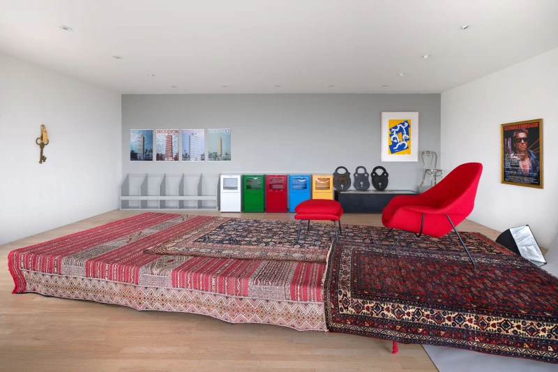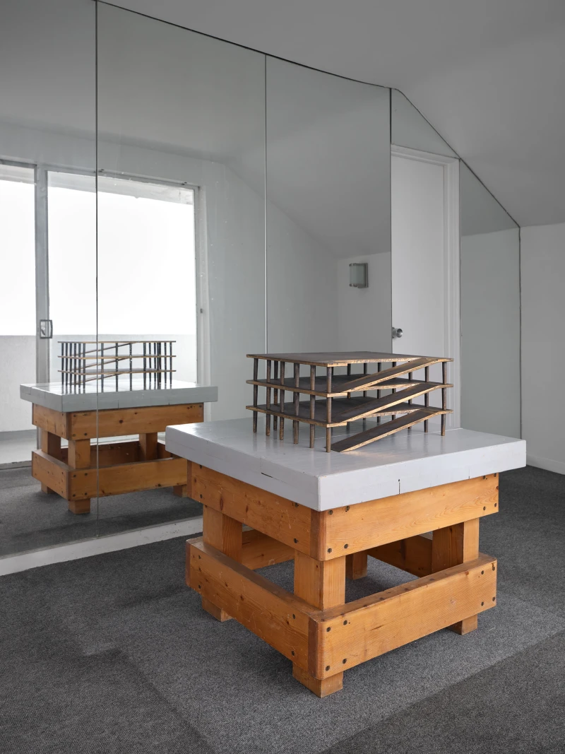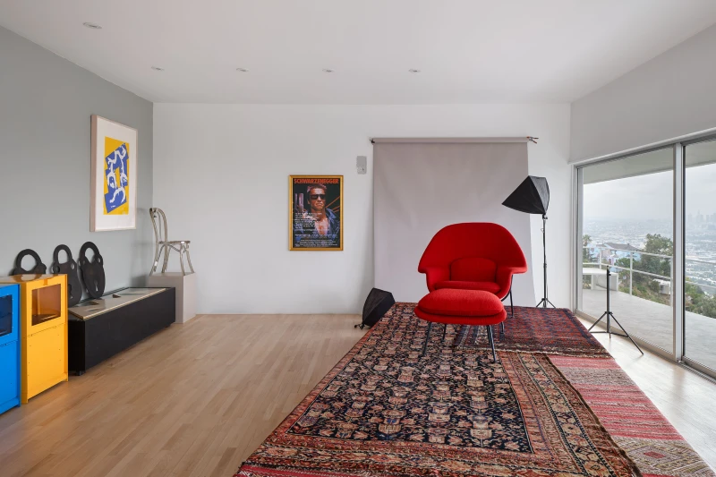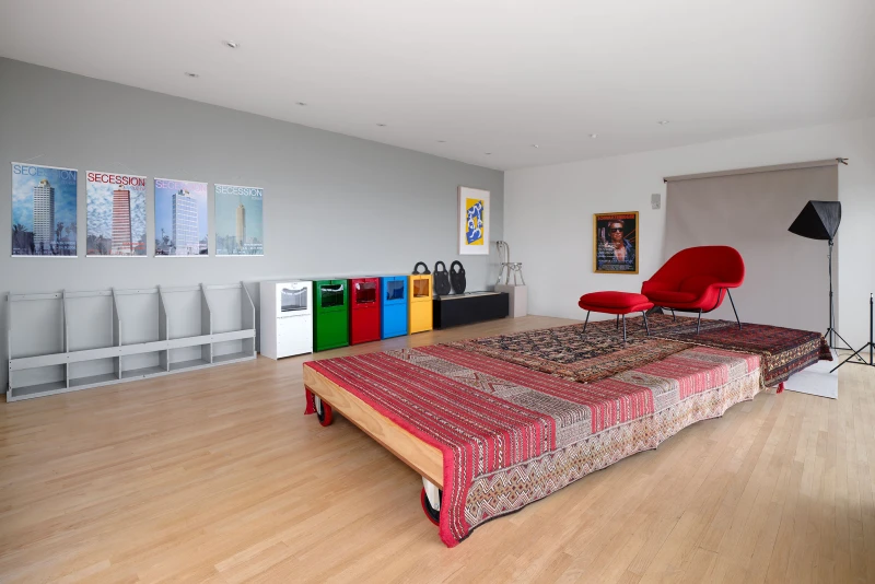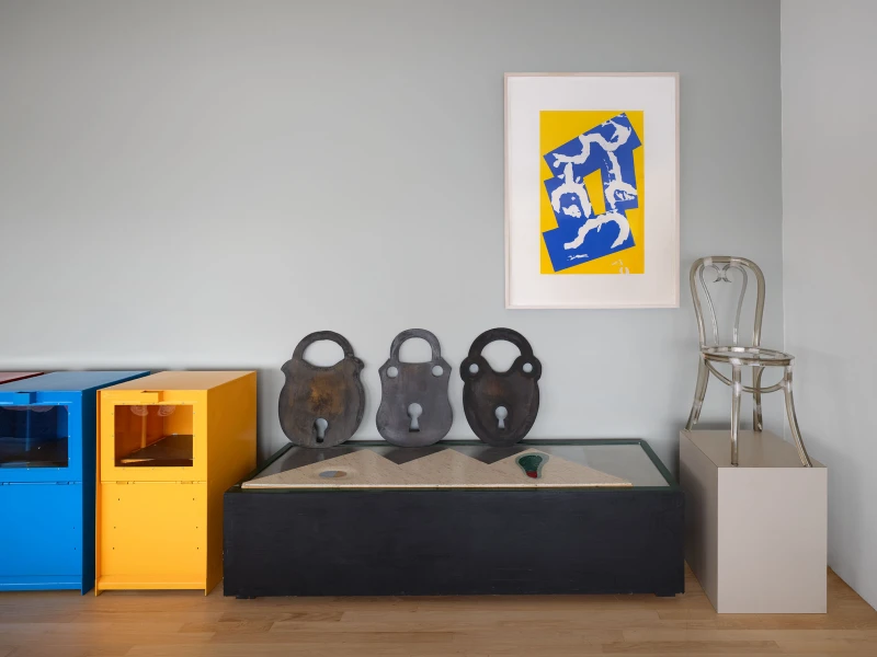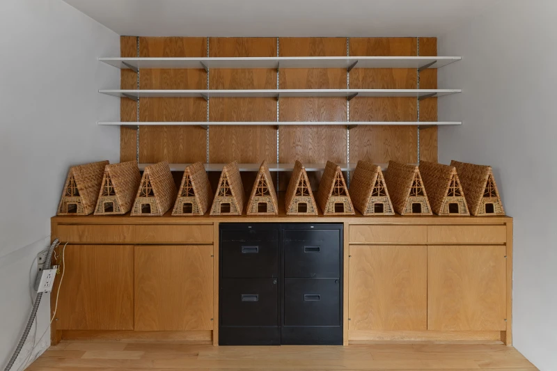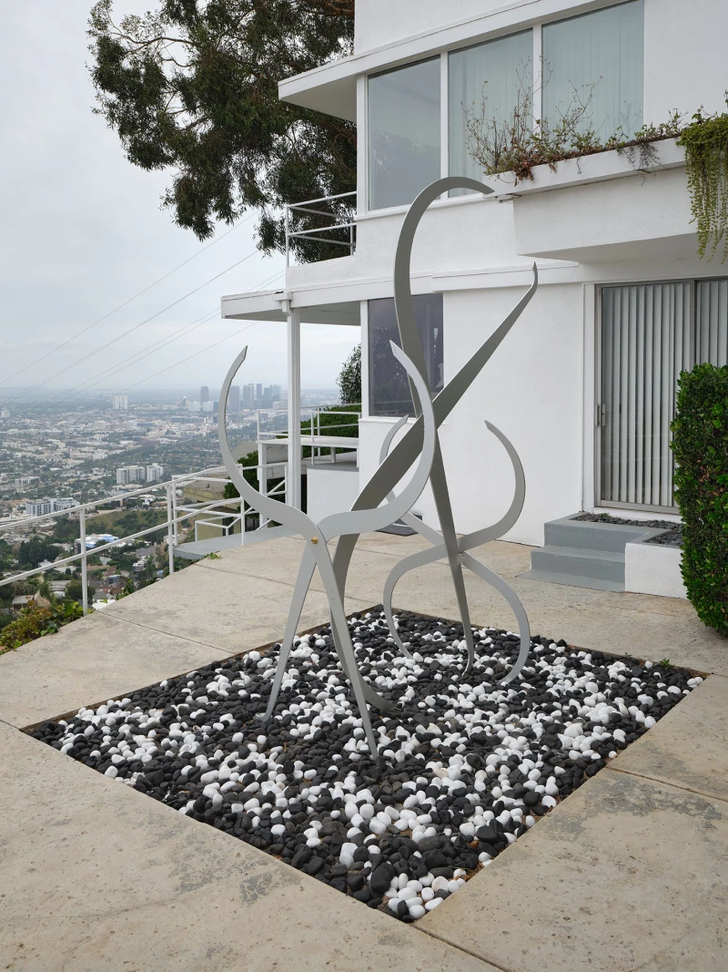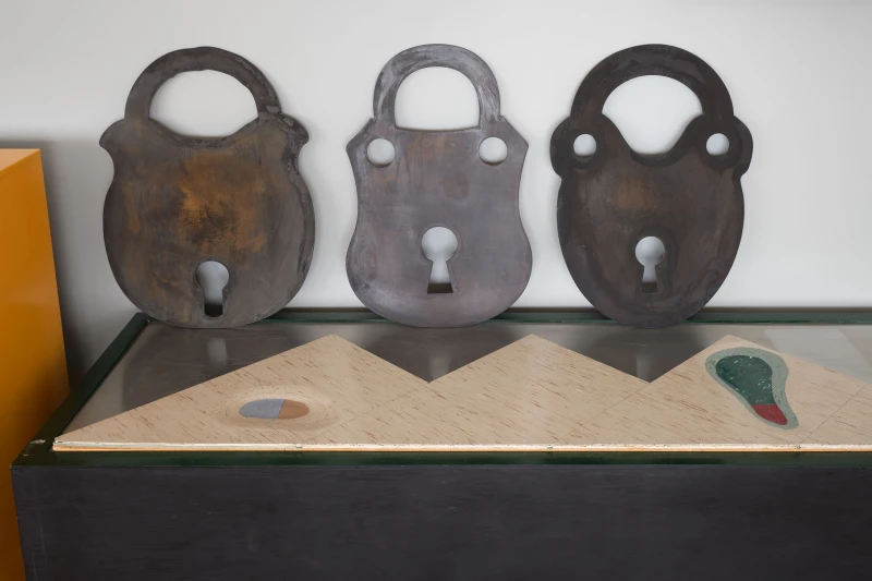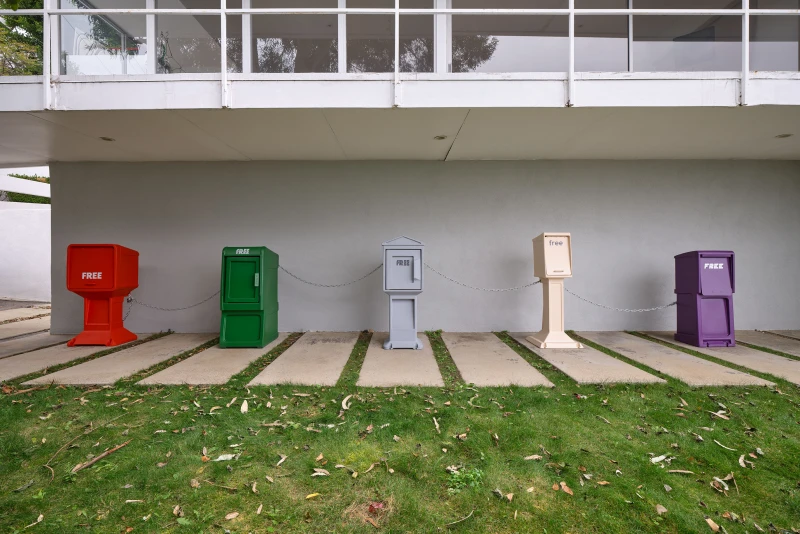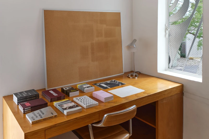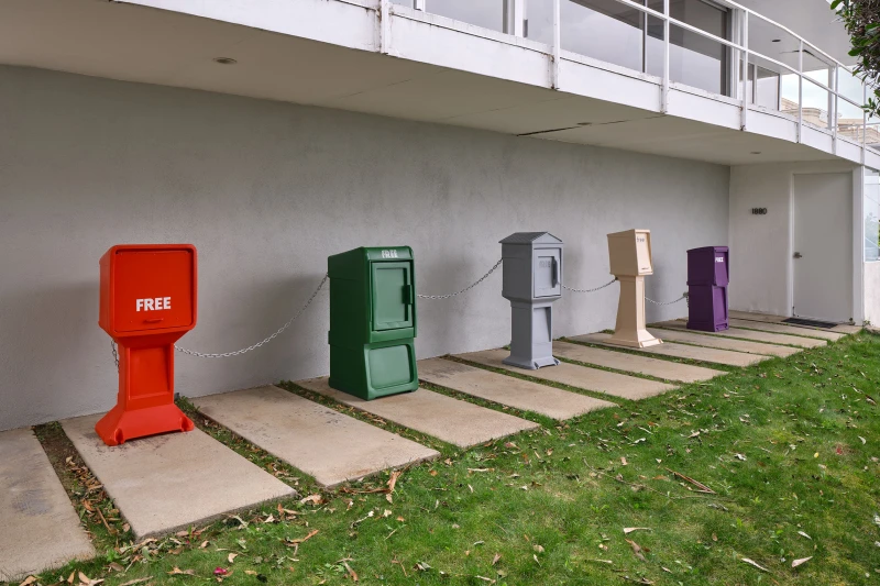 Presented by Del Vaz Projects and OKEY DOKEY KONRAD FISCHER, wunderkammer is an installation by Rita McBride at Blue Heights Arts & Culture—located at the house that the architect Richard Neutra designed for the German-Jewish émigré, artist/art collector, dealer, and educator Galka Scheyer in 1934. wunderkammer begins with McBride clearing space in her studio to create a singular, novel artwork. The circumstance of this rearrangement results in an amalgamation of past and in-process works hung and placed randomly. Situated similarly in this domestic setting (without chronology, rhythm, or reason), McBride’s works—often engaging civic space, urban infrastructure, and industrial fabrication—mold into compartmental, eclectic fixtures. While every element originates from a specific point in the evolution of her practice, here, each piece functions as a neighbor—relevant in its immediate relation to the artwork that it surrounds and the architecture that surrounds it. Moving from one object to the next is kinetic rather than choreographed; there is potential for perpetual reordering.