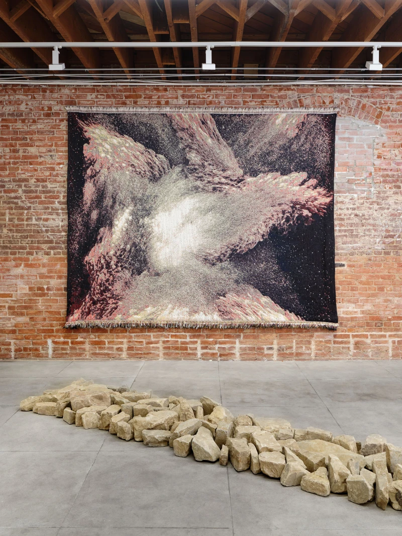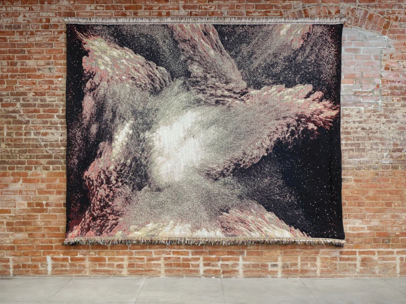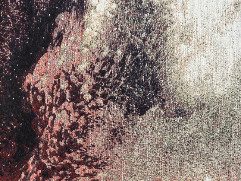 Presented here in the form of a woven wool tapestry, Imagine Inscape emerges in an atmospheric, almost spectral space. The work echoes early attempts to visualize unseen forces, particularly those of Hippolyte Baraduc, a physician-philosopher of the early 20th century.