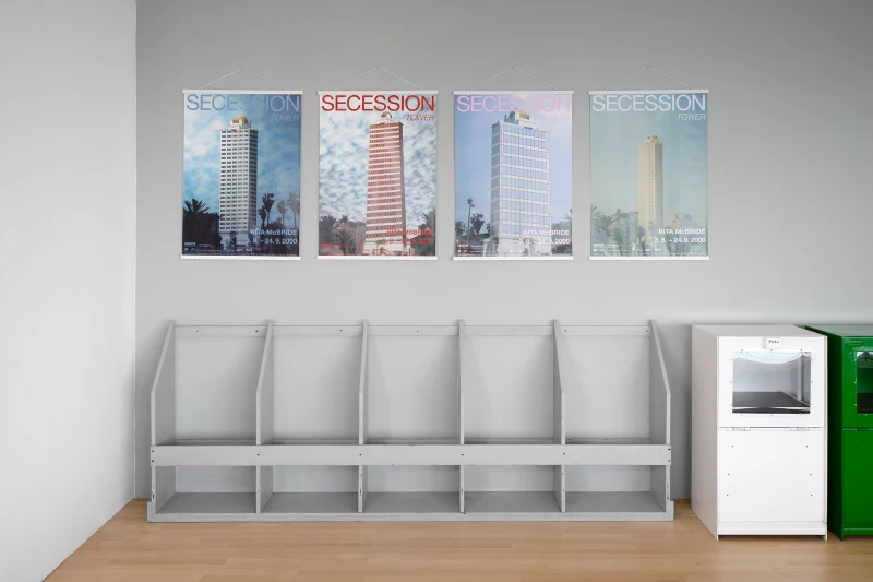 A caliper is erected at a colossal scale that transforms tool into spectacle; a mobile is constructed with Cosanti-wrought links and balanced with Murano-glass leaves; a promotional real-estate poster reimagines the Vienna Secession building as a luxury high-rise; a print is composed of a gestural, fax-warped reproduction of Le Corbusier’s designs for Algiers; highway ramps are coated with horizon-line hues and faded in the sun; silhouettes of gigantic keys and locks from around the world are cut out of brass sheets and patinaed; found newspaper dispensers are spray-painted into monochrome totems that house and disseminate free literature (such as this). Aspiring to precision, function, and idealism, Modernist architecture intrigues McBride with its inescapable complexities, failures, and humor. Her works test the extent to which the artist can approach democratic structures democratically, inviting both play and plan through actions of unlocking, tinkering, and reconfiguring. Like a body moving through space, these works orient rather than explain: implicit, visceral, and absurd.
